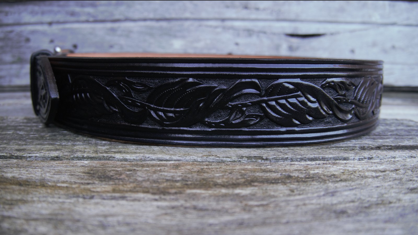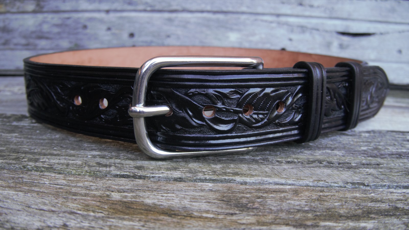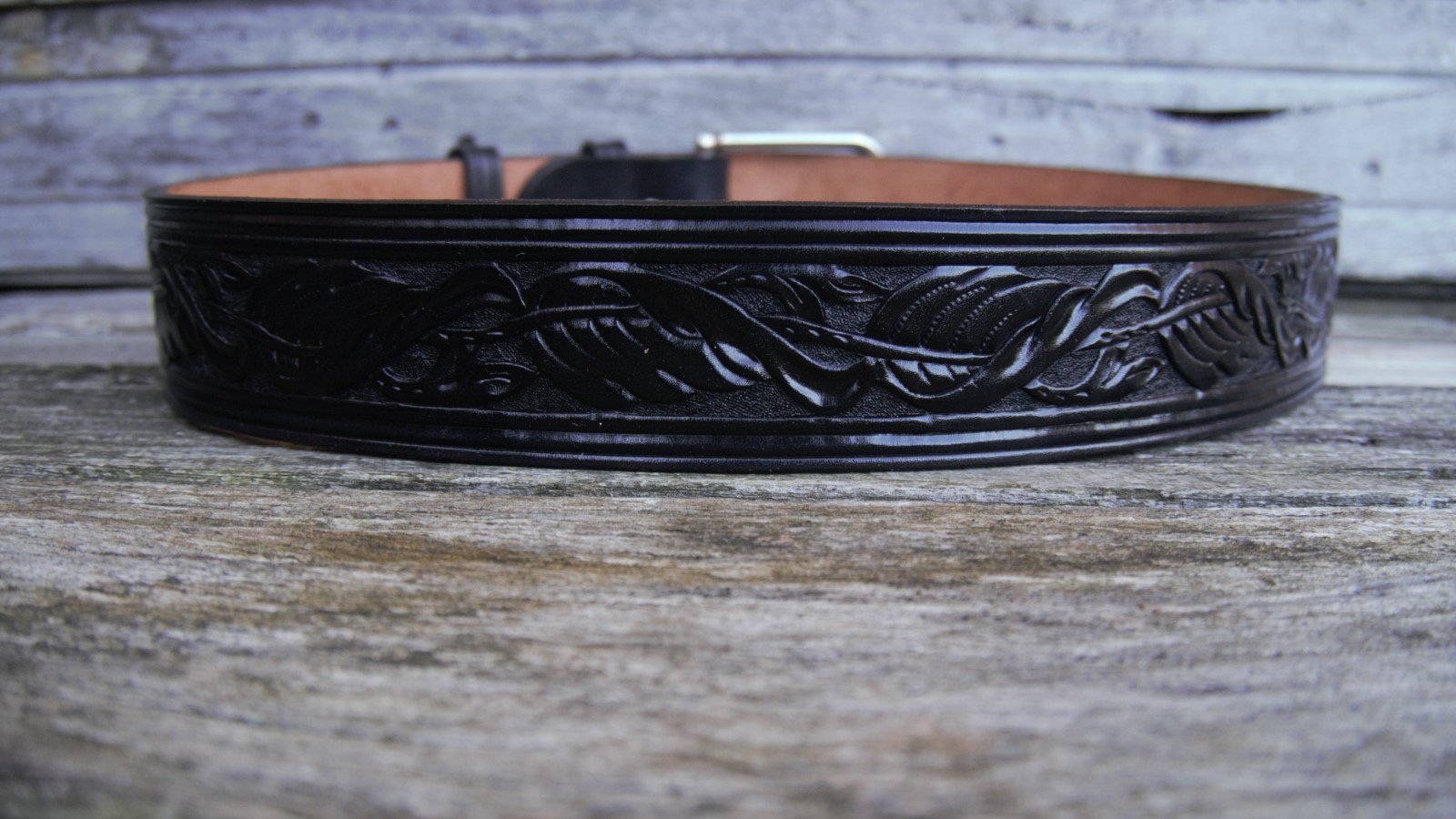 Categories: 15oz Vegetable Tanned Cowhide, 2 Inch wide leather belts, Black, Hand Carved / Tooled, Heel Bar Buckle