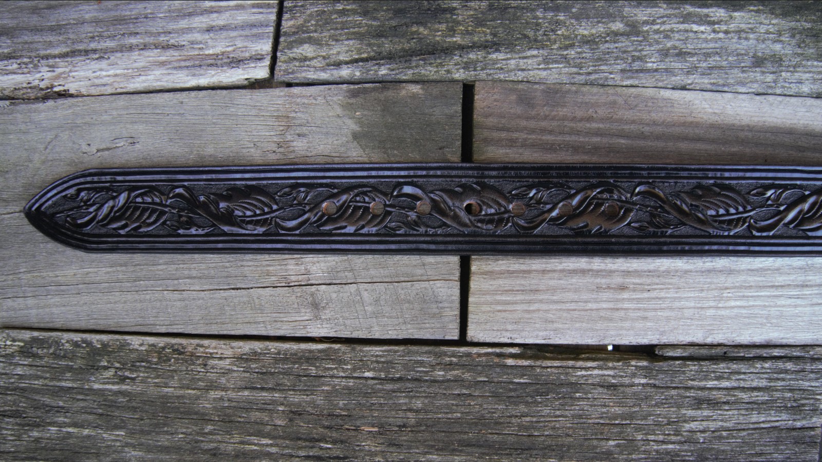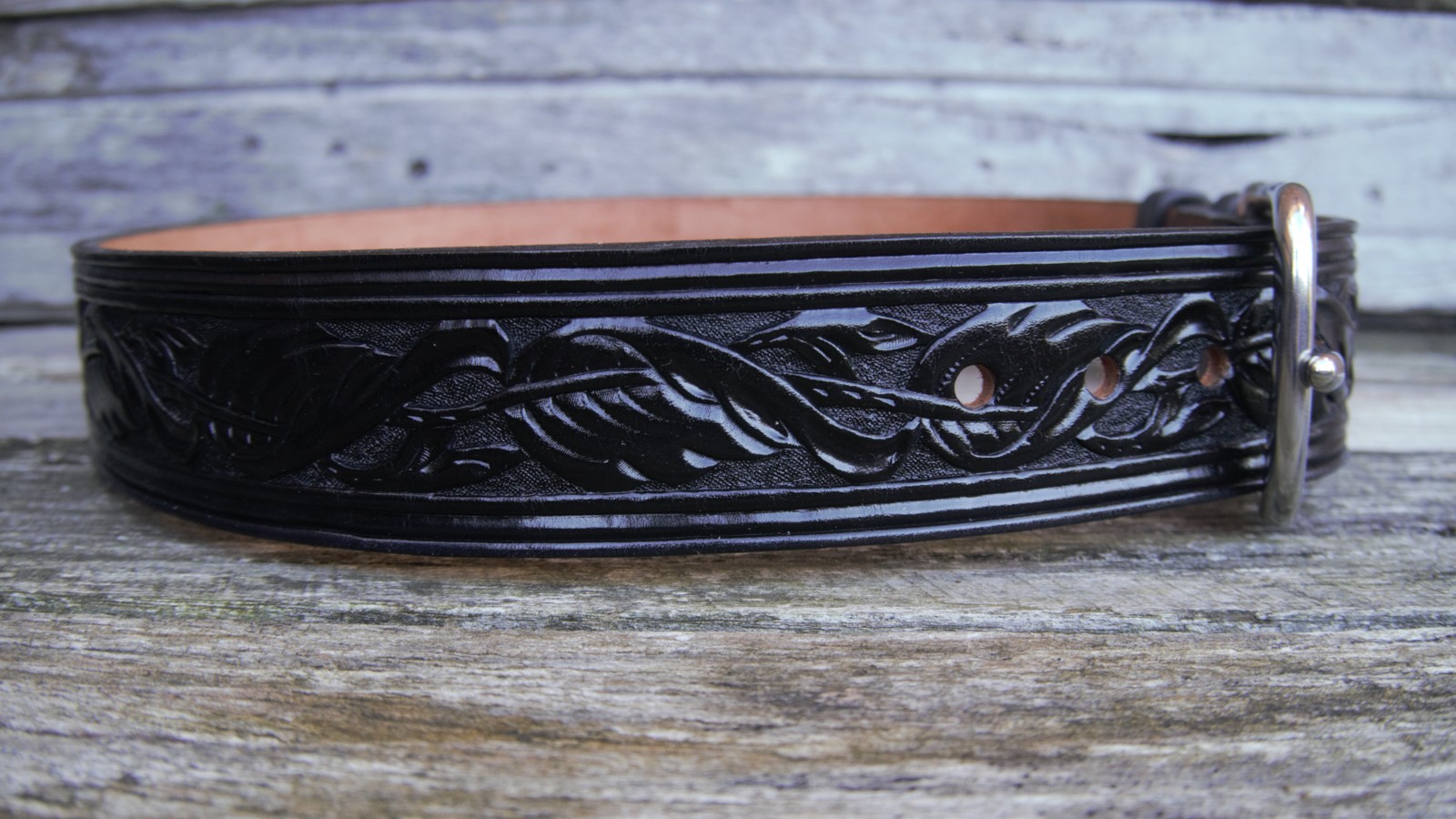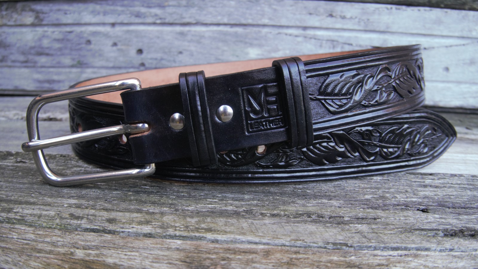 Categories: 15oz Vegetable Tanned Cowhide, 2 Inch wide leather belts, Black, Hand Carved / Tooled, Heel Bar Buckle